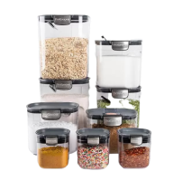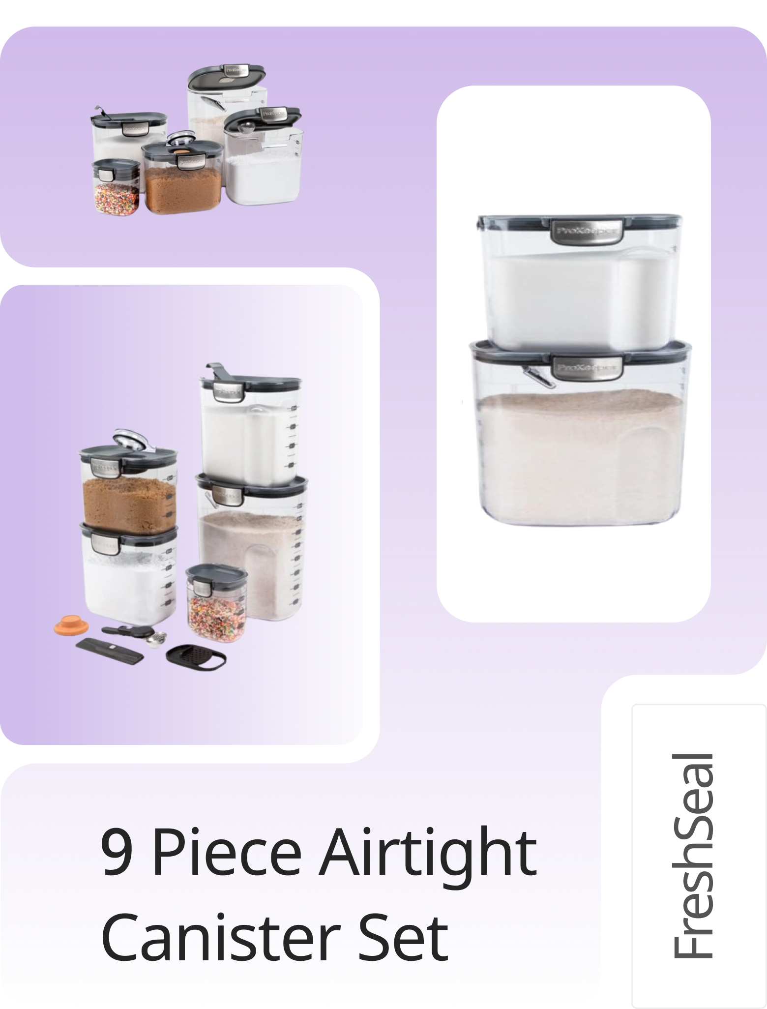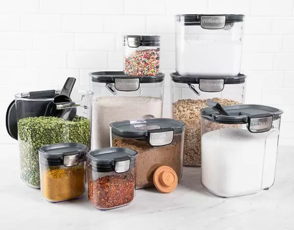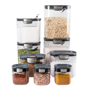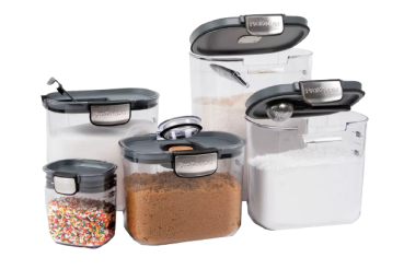 The FreshSeal 9-Pieces Clear Kitchen Container Set includes storage containers for flour, granulated sugar, brown sugar, powdered sugar, coffee and a mini keeper. Each FreshSeal features its own specialized, integrated tool. This set includes six stackable food storage containers with easy-catch lids and silicone seals for airtight storage to keep your kitchen organized and your food fresher longer.