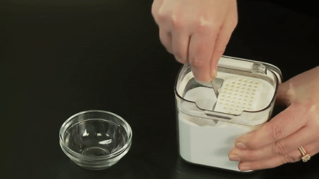 Dishwasher-safe; Material: Plastic, silicone, and stainless steel; Color: White and clear